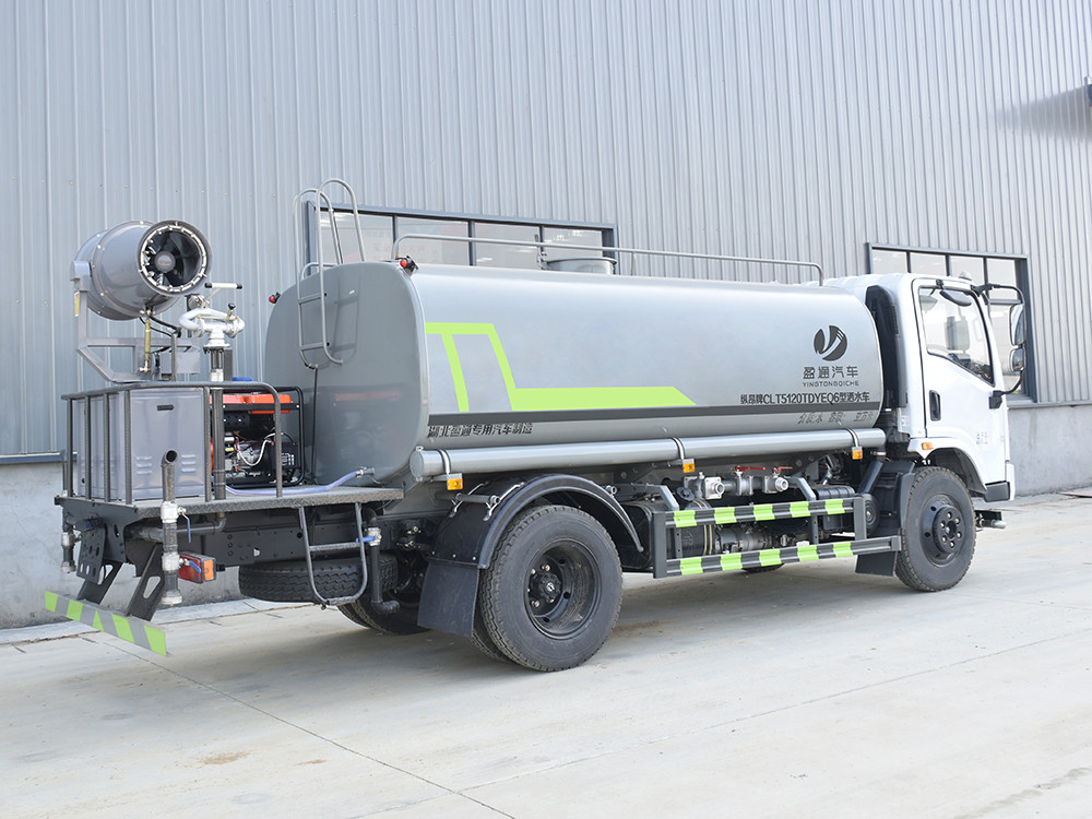 10方抑尘车产品配置 1.底盘配置: 发动机云内 150 马力(四缸),万里扬 6 档变速箱,前桥 2.2 吨, 后桥 4.2 吨,8.25 钢丝胎,轴距 3800,断气刹,ABS,空调,电动玻璃, 中控锁。2.上装配置: 1、罐体约为 10 方,可加装 30 型雾炮 2、边灯带电,罐体尾部上方标配 2 个红色示宽灯, 3、标配前喷为鸭嘴直冲,标配后冲,用户可根据自己的需求,来调 整对冲位置。 4、花纹防滑平台,炮筒后盖为定制型螺栓卡扣, 5、前喷、后冲、后洒、侧喷,绿化高炮开关球阀均采用 50 大通经 不锈钢球阀, 6、新式轴承式水炮,更加耐用, 7、40-50 型水泵, 8、防腐法兰垫片, 9、铝制后洒,不易炸开 10、罐体自动焊(美国林肯焊机及电源),拼板自动焊接,封头环 缝焊接,无气孔,焊缝美观。 11、侧护网、后保险杠、均为螺栓连接,方便拆卸,维修方便。 12、塑料挡泥板,替代铁挡泥板,更加轻便,用螺栓连接,方便拆 卸。 13、前部、后部主管连接处为 6 孔圆法兰,不易冲垫