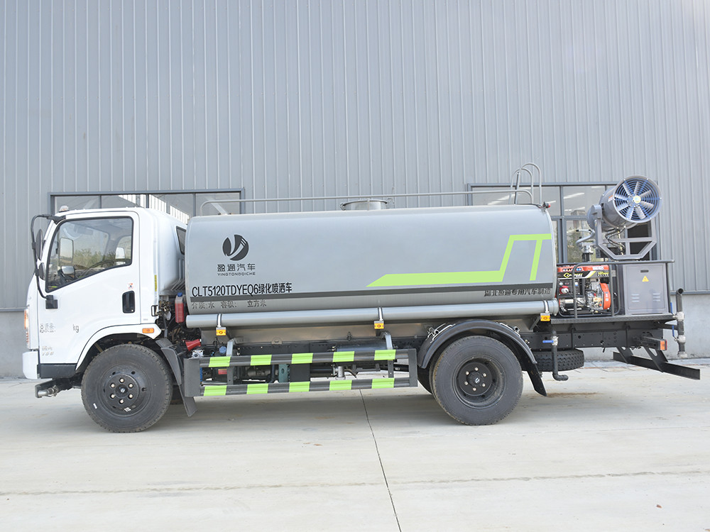 10方抑尘车产品配置 1.底盘配置: 发动机云内 150 马力(四缸),万里扬 6 档变速箱,前桥 2.2 吨, 后桥 4.2 吨,8.25 钢丝胎,轴距 3800,断气刹,ABS,空调,电动玻璃, 中控锁。2.上装配置: 1、罐体约为 10 方,可加装 30 型雾炮 2、边灯带电,罐体尾部上方标配 2 个红色示宽灯, 3、标配前喷为鸭嘴直冲,标配后冲,用户可根据自己的需求,来调 整对冲位置。 4、花纹防滑平台,炮筒后盖为定制型螺栓卡扣, 5、前喷、后冲、后洒、侧喷,绿化高炮开关球阀均采用 50 大通经 不锈钢球阀, 6、新式轴承式水炮,更加耐用, 7、40-50 型水泵, 8、防腐法兰垫片, 9、铝制后洒,不易炸开 10、罐体自动焊(美国林肯焊机及电源),拼板自动焊接,封头环 缝焊接,无气孔,焊缝美观。 11、侧护网、后保险杠、均为螺栓连接,方便拆卸,维修方便。 12、塑料挡泥板,替代铁挡泥板,更加轻便,用螺栓连接,方便拆 卸。 13、前部、后部主管连接处为 6 孔圆法兰,不易冲垫