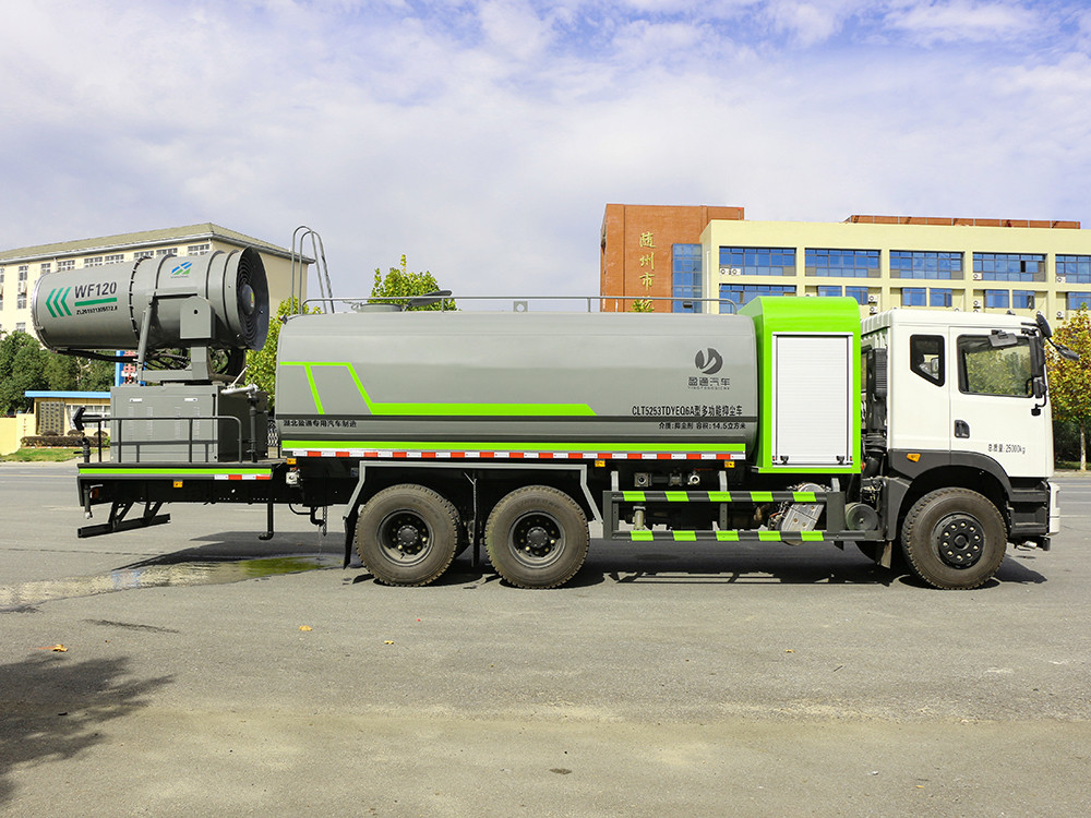 东风华神 大型17方抑尘车-雾炮车 简述 抑尘车又称为绿化喷洒车、多功能洒水车、园林绿化洒水车。抑 尘车适合于各种路面冲洗,树木、绿化带、草坪绿化,道路、厂矿企业 施工建设,高空建筑冲洗。抑尘也可以作为运水车使用,**常见的车 型有绿化喷洒车、多功能洒水车、绿化洒水车几大类。 我公司产品标配前喷(鸭嘴)、后冲、后洒、侧喷、后置式工作 平台,平台上配置绿化水炮(可 360°旋转,既可以调成柱状,也可 以调成雾状,更可以调成直冲状、大雨、中雨、小雨、毛毛雨),配 备优质大功率专用洒水泵(可自吸自排,可从河里或池塘抽水到罐体), 取力器,杂物过滤网,消防接口,自流球阀系统、取力器、球阀、滤网 均为**标准产品,主管道加粗,法兰垫、法兰盘加厚,大通径球阀。 整体具备性能优良安全可靠、效率高、流量大、维修方便等特点。