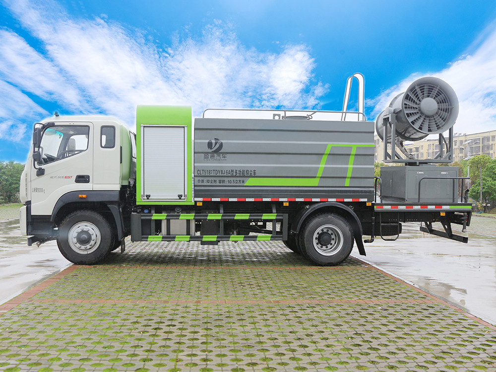 三.产品主要技术参数 序号 名称 型号、规格 1 整车型号 CLT5187TDYBJ6A 型多功能抑尘车 2 发动机型号 YCS06245-60 3 发动机马力/功率 玉柴 245 马力/180KW 4 发动机排量 6234ML 5 变速箱 法士特 8 档(带高低档) 6 轮胎规格 10.00 钢丝胎 7 轴距 4500 8 总质量 18000KG 9 整备质量 9800KG 10 额定载质量 8005KG 11 整车尺寸(长×宽×高) 8.67*2.5*3.8 12 罐体容积 12 方 13 燃料种类 柴油 14 排放标准 国六 15 水泵型号 60/90 16 罐体材质 Q235 碳钢